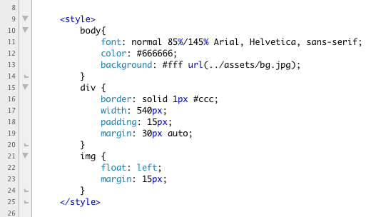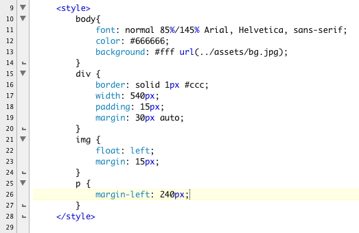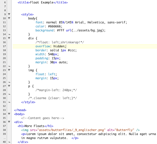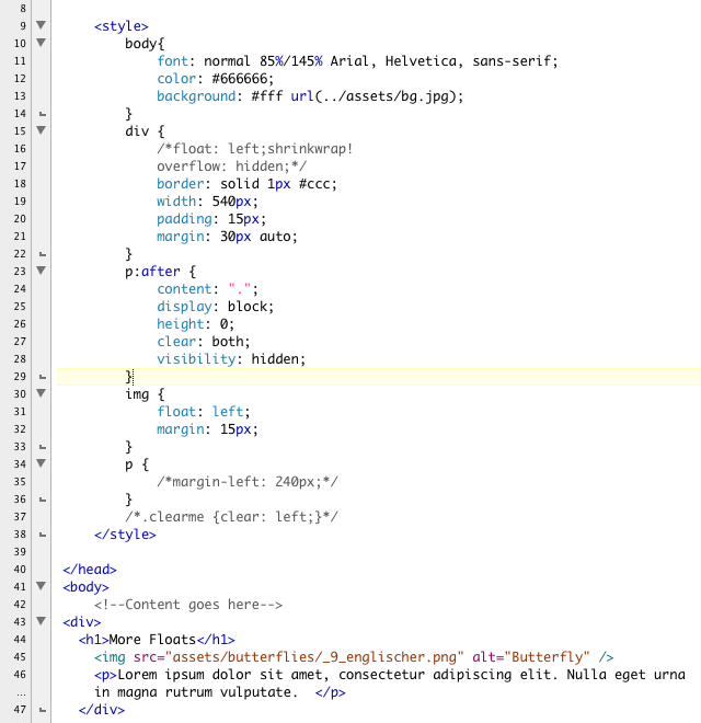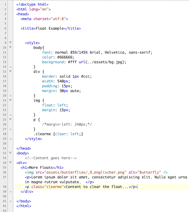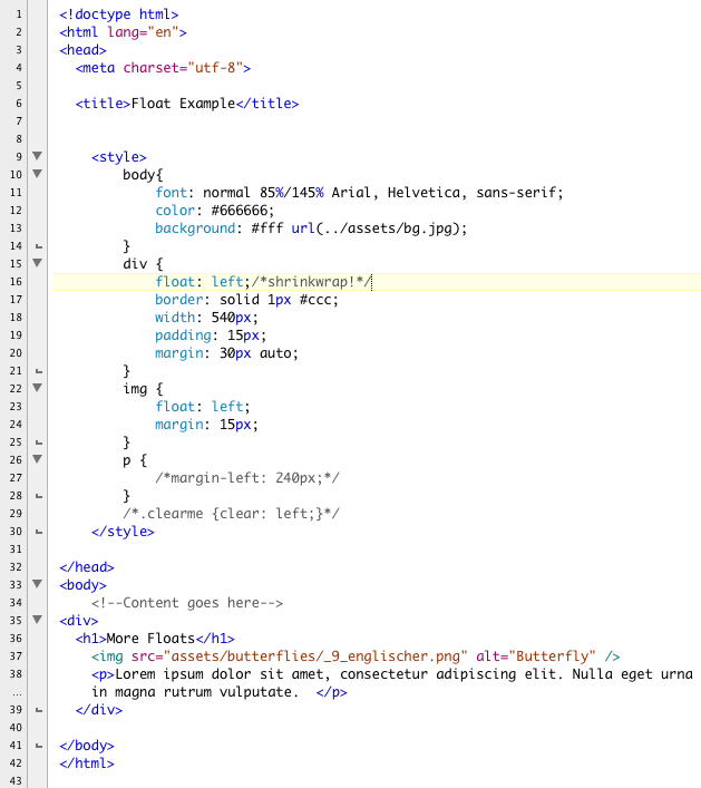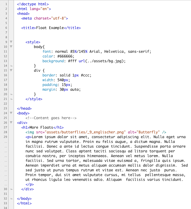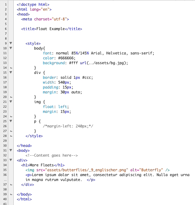 We are going to completely rewrite the contents of the style tag in the head of our document, so you can remove all the styles from the float example.