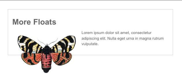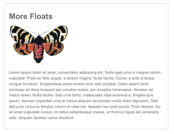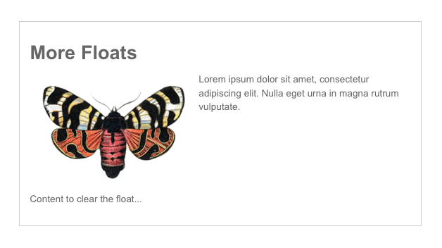 This looks like a bug (and we're not talking about the butterfly) but it is the expected and proper behavior. The float disrupts the normal flow of the page. Now the parent div needs help. For the parent div to encase the content, it needs to have a cleared element.