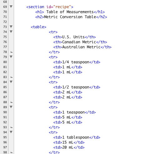 Add a new h1 tag and name the page Table of Measurements. For the purposes of this demonstration we are building a table that compares American units of measurement with Canadian and Australian. You can use different data if you like. We found ours at: