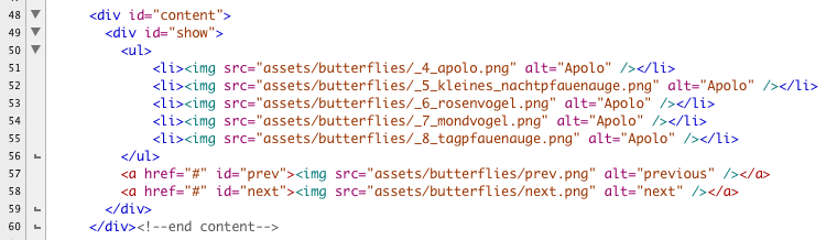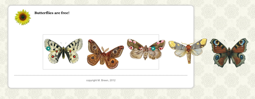 Duplicate your floats.html file and name the new file "positioning.html". Again our demonstration file uses PNGs of butterflies. Yours will be different. In addition to the images already on the page you need a graphics for a "back" and "next" button. Triangles and arrows work well, or you can use text.