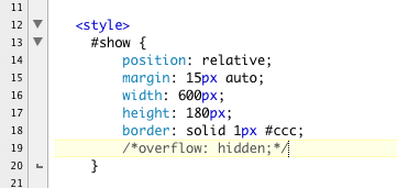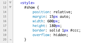 First we define the show div as a box 600px wide, 180px tall with a solid grey border. It has a top and bottom margin of 15px and is centered inside the content div.