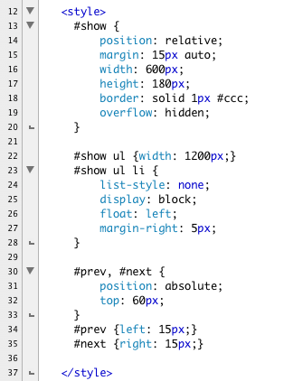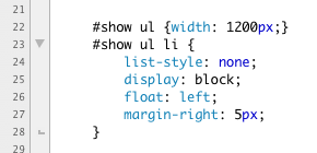 Our images are list items in an unordered list nested inside of show. First we give the unordered list a width so that all the floated li tags will have room to spread out.