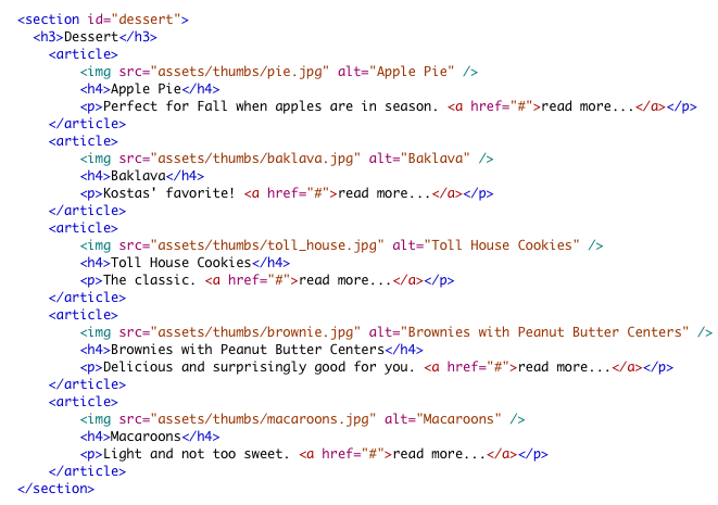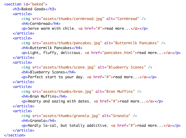 For each article tag add a thumbnail of the recipe. Here is the code for the Baked Goods section: