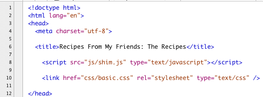 The first thing we need to do is update the HTML. Open recipes.html in your text editor. Tear out and old CSS and update the head to match the pancakes.html head. It should include a script tag to the shim.js file and a link to the basic.css file like this: