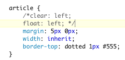 Next we turn our attention to the article tags. In our reset CSS we defined the article tag as a block level tag. Each article will contain a floated image, so the article itself will need be floated left to contain the floated image. Since the article tags are floated, they will also need to clear the floats. Line 140 clears the floats, Line 141 adds a float left to each article.