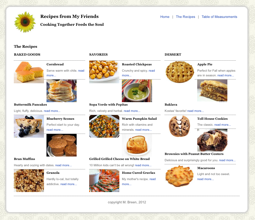 The look and feel is also up to you. You can re-shape and re-design the recipes that you get from other students. Feel free to experiment with imagery, icons, colors, and typography. CSS is to be used for all styling and positioning. Tables may be used for tabular data only.