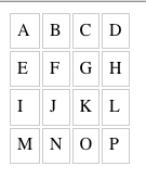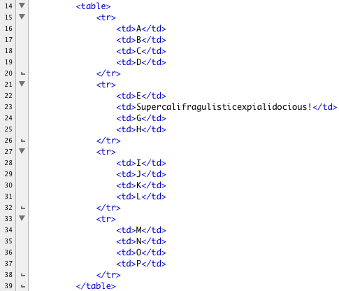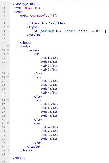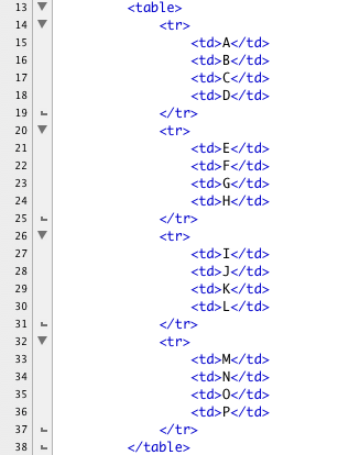 To see the columns, let's add more rows. Add three more rows, and nest four cells in each row. Place a letter in each cell. Below is the completed code. (Here's a nice tip -- copy the first tr tag with it's nested td tags. Paste three more copies and change the letters. Life is short.)