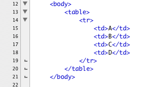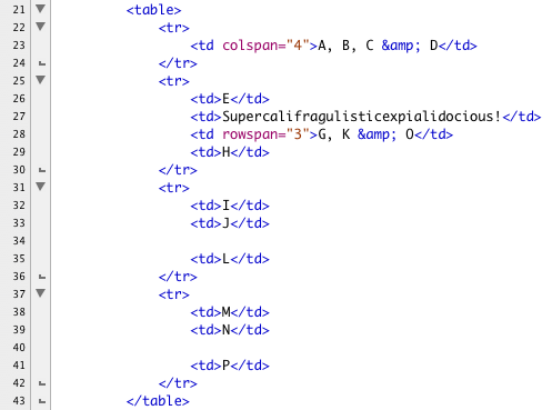 The A, B, C and D cells are collapsed into one. Notice the removal all the extra td tags. Here is the code:
