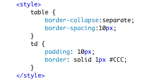 CSS provides extra support for tables. The border property has a variation that states what happens when two cells are next to each other. The border-collapse property allows you to either collapse borders next to each other or separate them. If you choose to separate them, you can control the space between cells with the border-spacing property, like this: