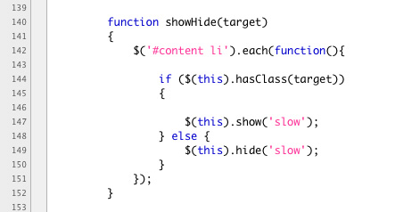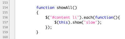 Our last function, the one that shows everything, doesn't require an argument. It will have the sensible name "showAll()." It uses the each() method to loop through all the li tags in content and show them, once again, using the "this" keyword.