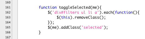 Our second function's name is toggleSelection() and is passed the id of the button that was clicked. It uses the each() method to loop through all the a tags that are wrapped by li tags in filters div. Again, the "this" keyword is used with each a tag in turn. The class is stripped off the a tags.