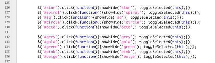 Our second function will be used by the filter buttons to highlight the chosen button. Remember the class we defined called "selected?" When a button is clicked, it will receive the "selected" class. The previous button will have the selected class stripped off. The second function also takes a single argument -- the name of the button that was clicked.