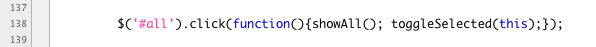 The all button gets a slightly different event handler. It calls the showAll() function before calling the toggleSelected() function. It looks like this: