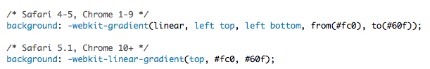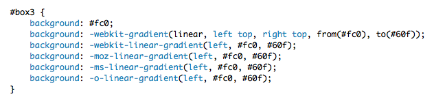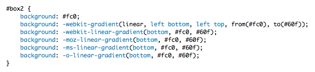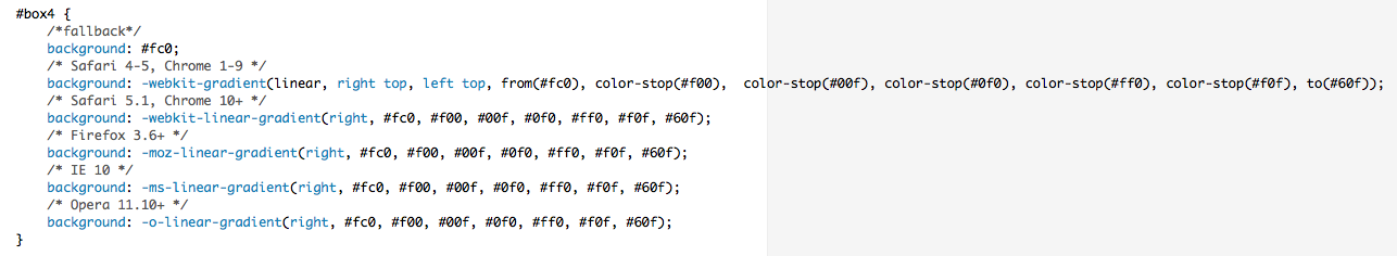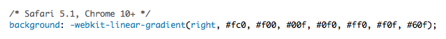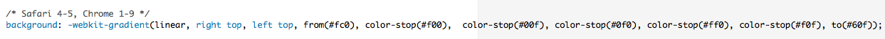Additionally you can make complex gradients with multiple colors by adding color stops. Again the earlier versions of Safari and Chrome use a more complex syntax. The color stops are explicitly stated like this: