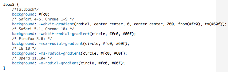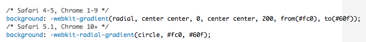 Radial gradients are similar to linear gradients. The newer browsers all use a separate property to define linear and radial gradients. With the older version you state the gradient type in the definition. With the newer browsers you use the radial-gradient property (with the vendor prefix), state the origin, the start color, the end color and you're done. here is what the syntax looks like.