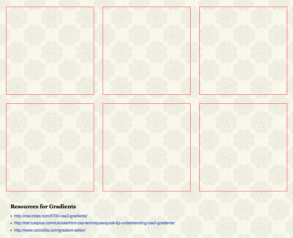 To get an understanding of how gradients work in CSS we're going to build a page with six boxes. Each box will have a different gradient fill. Gradient fills are complex to both understand and write so we'll include some resources at the bottom our page for further research.
