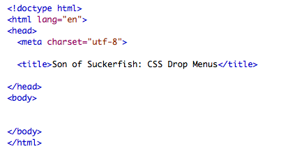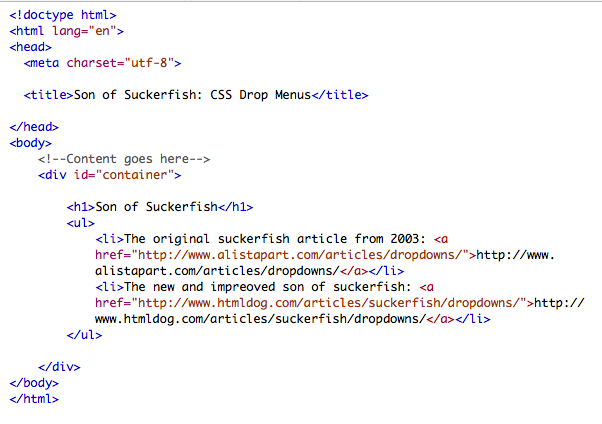Add a div to the body tag and give the div the id of "container". Add a title using an h1 tag, if you like you can include the article links to the suckerfish technique articles.
