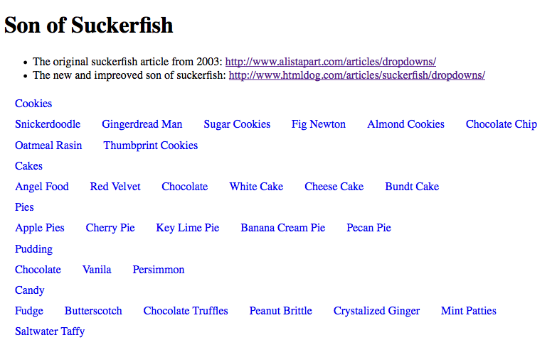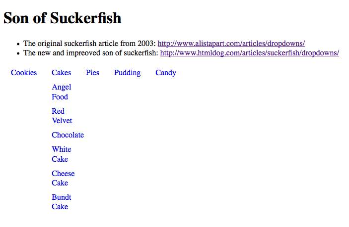 Now we are going to explore pure CSS drop menus. We are going to look at the powerful "son of suckerfish" technique. The son of suckerfish technique is based on the older suckerfish menu technique. The suckerfish technique is powerful conceptually. If you understand it how it works well you can use it in a wide variety of ways to build original and exciting pages.