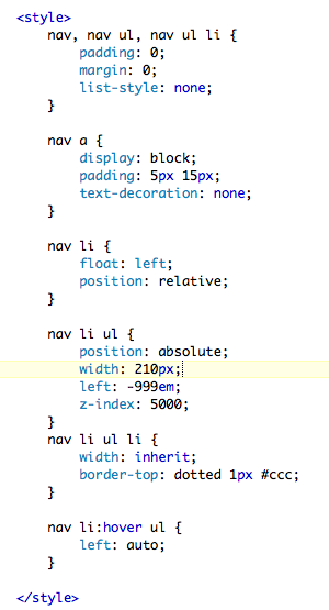 We add a style that targets only the nested ul tags. We set the position property to absolute. Then we set the left property to a ridiculously large negative number. Here we have used -999em. You could set it in pixels too, it won't matter. The important thing is to hide the menus off to the left of the browser's edge. Finally we give the nested ul tag a huge (5000!) z-index. This insures that when the list is brought into the browser window it is on top of any content on the page.