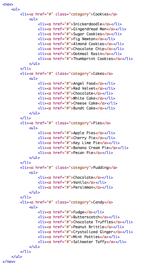 The nested unordered list is wrapped inside the parent li tag. Below is the first category, the cooky category, with it's child list in place: