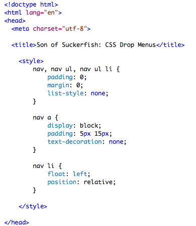 Inside the head tag, add a style tag. First we do a basic reset to remove the default margins and padding on the nav, the ul and the li tags. While we're at it we can remove the list style.