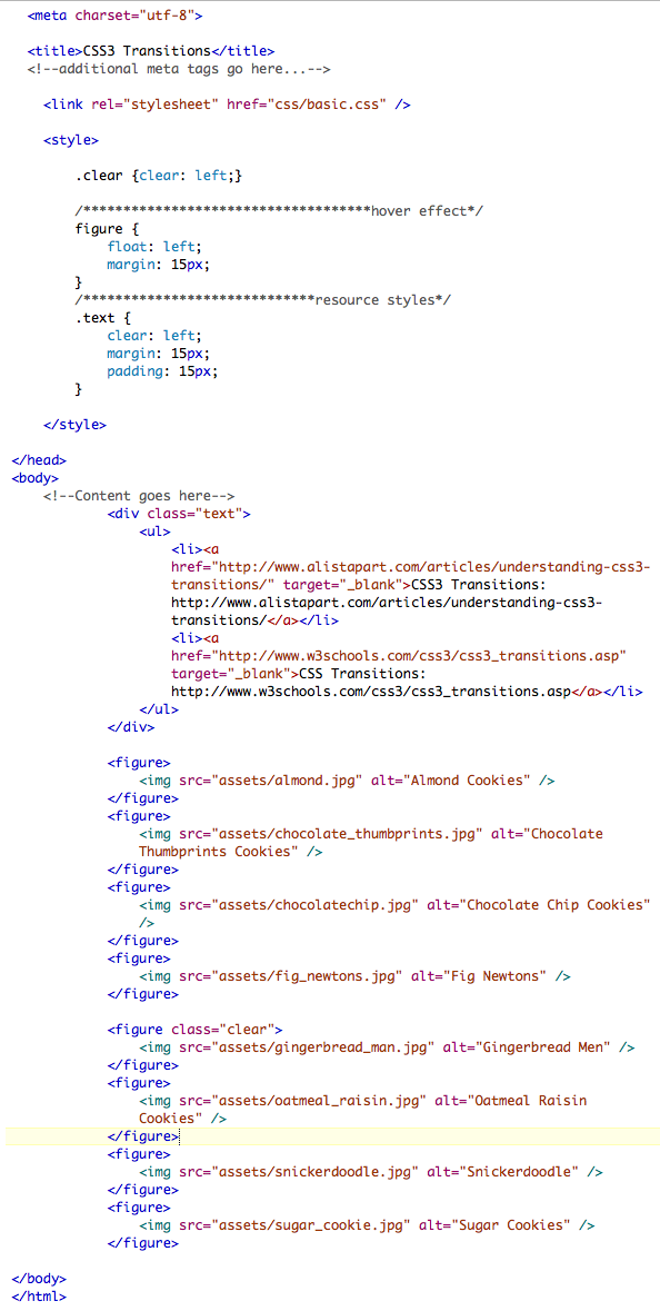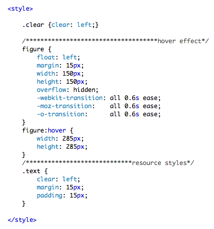 We write a hover style for the figure tag adjusting the width and height. Our example takes .6 seconds to animate, just over half a second. Here is the completed code:
