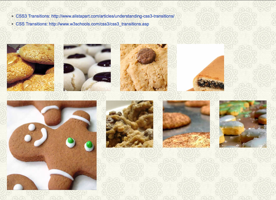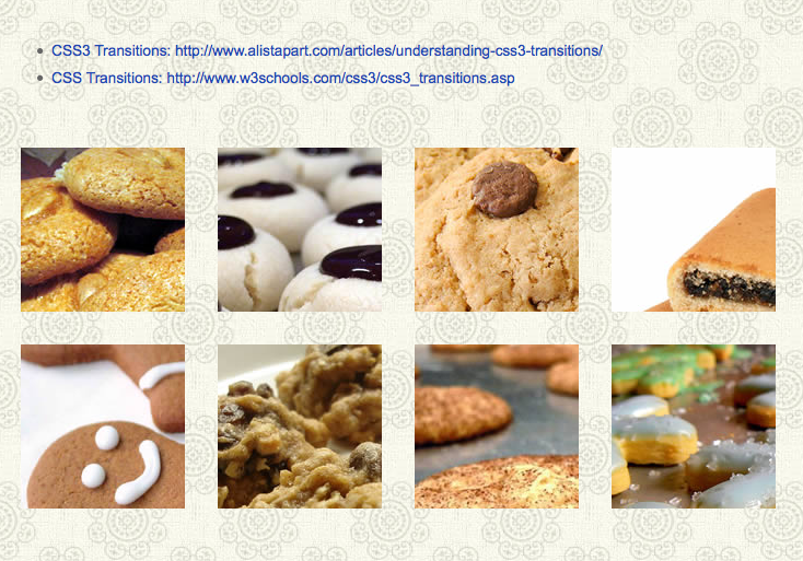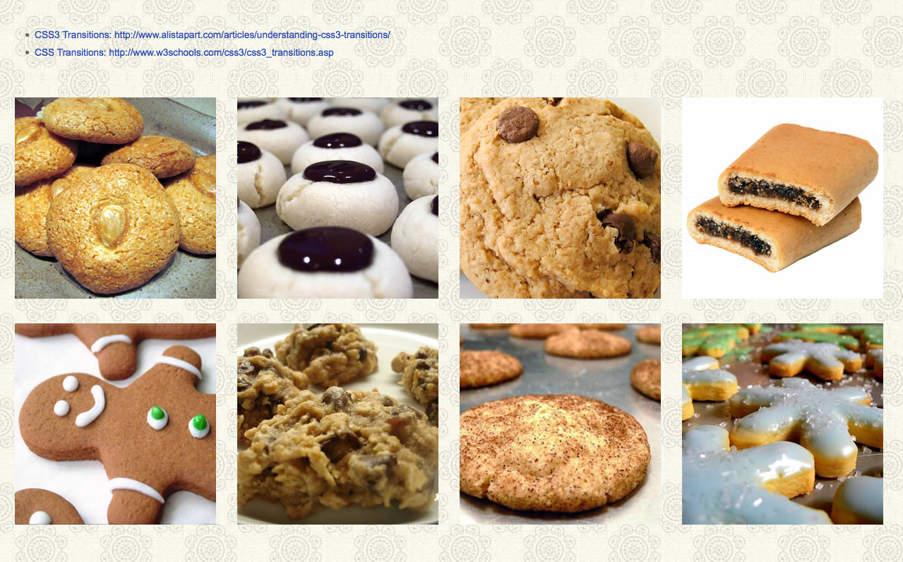 To complete this module you will need six to ten images. Make sure these images are sized so that three will fit across the container. The demonstration file uses images that are 285 x 285px square. The demonstration images are all of cookies. (Okay -- time for us to come clean. When we built the demonstration files we were all on a diet.)
