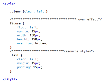 Add a style tag to the head of your document. We are going to use CSS transitions to make a handsome hover effect. The caption will not be visible to the user at first. When they hover the mouse over the image, a transparent background will fill the image and the caption will appear and be readable. When the user mouses out, the fill and caption disappear.