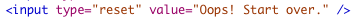 The reset button works the same way, only the value has been changed to "reset". It too takes the value attribute and uses it as the default label. Its code looks like this: