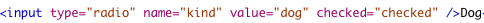 Here is the code for the kind of pet section. It is a block of radio buttons with the default set to "Dog".