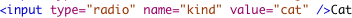Notice the name in both cases is "kind", meaning the kind of animal. The name value is used by groups of radio buttons to force the "only one" behavior. If all the radio buttons have their name value set the same, then only one can be chosen. If the name value is set to different possibilities, then the user can choose as many as they like.