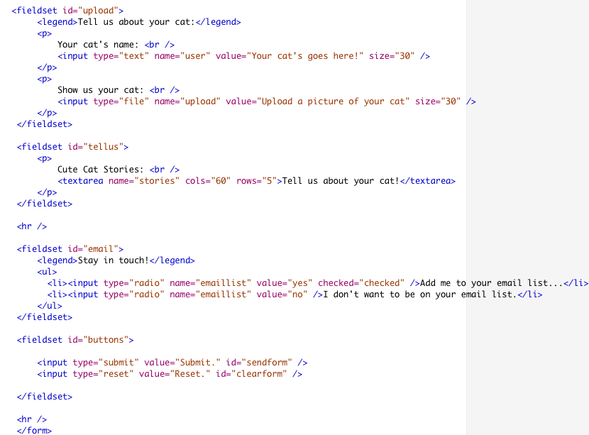 Everyone likes to share stories, so we include a textarea for everyone to share their cat stories. The fieldset is named "tellus". That ends this grouping so we add another hr tag.