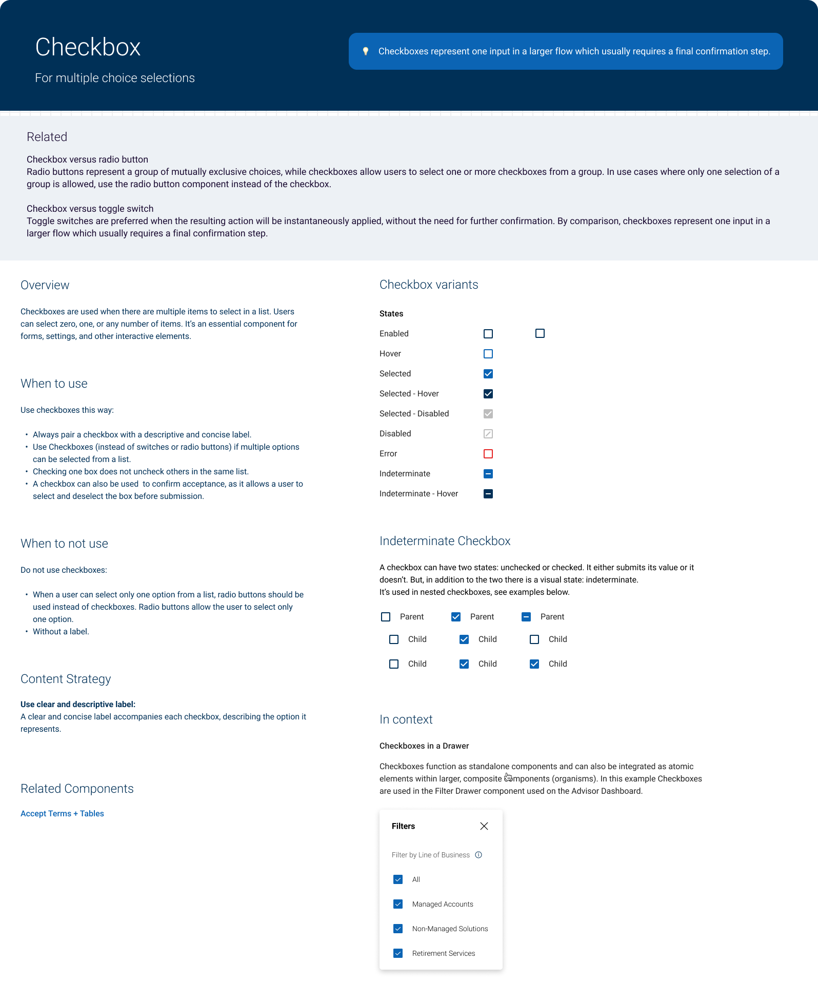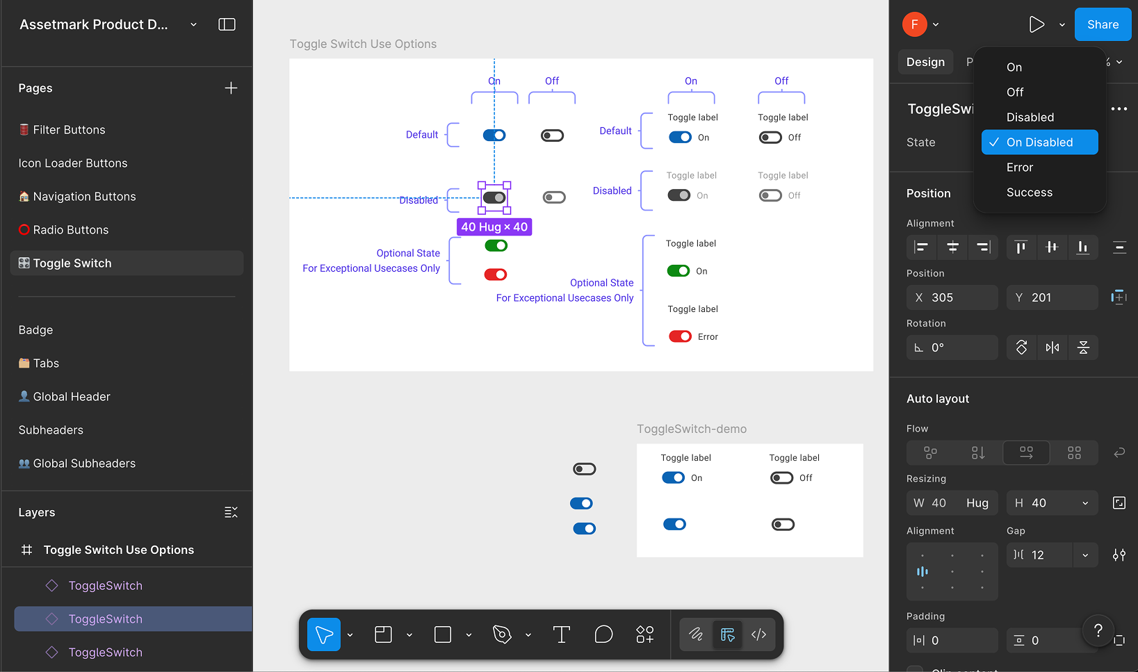 In the Figma Prototype below, the documentation and components are fully functional and can be easily added to new product designs with all state management set and functional in Figma. This component feeds into Storybook and is the same in the UI Toolkit. Its source code is linked to this Figma Design System Component by various APIs directly into designer's files and developer's IDE and Storybook.