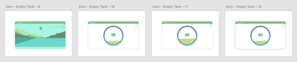 Initial designs had a card theme to showcase the scoring system. The goal is to stay in the green zone. Early iterations of the green zone used various scales with both positive and negative numbers to show the point system and the user's progress.